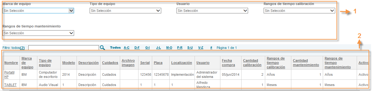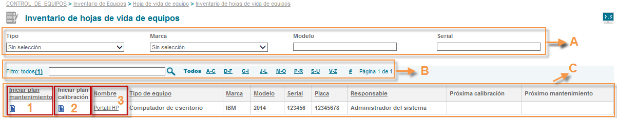 Si se requiere realizar un poco más a fondo la búsqueda de la hoja de vida del equipo se puede filtrar por letra. (Con la que inicia el texto, de la A a la Z) que contenga el título de la hoja de vida del equipo.