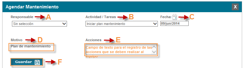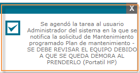 Guardar:Una vez se tiene todos los campos diligenciados o seleccionados y estamos seguros de la información que se acaba de registrar, guardamos la información e inmediatamente se agendará una tarea al responsable de realizar el mantenimiento del equipo.