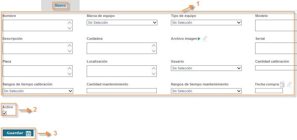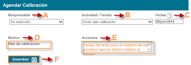 Guardar:Una vez se tiene todos los campos diligenciados o seleccionados y estamos seguros de la información que se acaba de registrar, guardamos la información e inmediatamente se agendará una tarea al responsable de realizar la calibración del equipo.