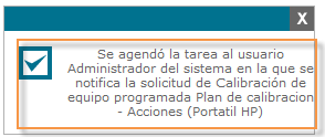 En la opción Iniciar plan de calibración ya no permite agendar la tarea para la realización del plan de mantenimiento, esto se debe a que ya se realizó el agendamiento, de acuerdo con la fecha establecida para el mantenimiento, el sistema calcula cuando será el próximo mantenimiento de acuerdo con la periodicidad establecida e indicada al momento de crear la hoja de vida del equipo.