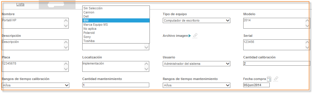 Marca de equipo:Lista desplegable donde se podrá seleccionar la marca del equipo. Las marcas de equipos se cargan por listas de valor.