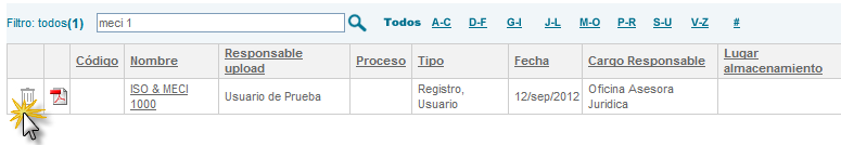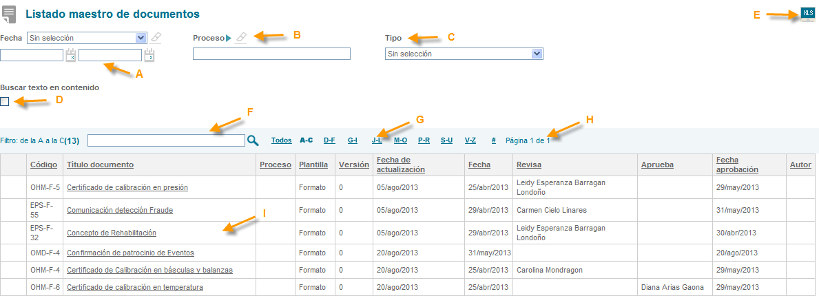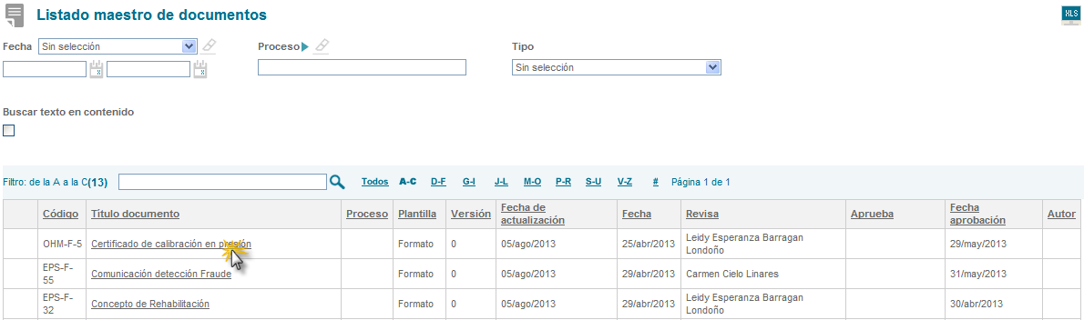3. Proceso: Opción de filtrar el listado de documentos por un proceso especifico.