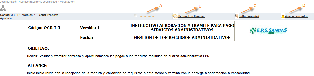 Aprobado: Documentos aprobados del sistema de gestión, estos documentos se encuentran disponibles en el listado maestro de documentos para consulta de todos los usuarios, siempre y cuando estén activos.