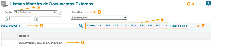 2. Lista desplegable para filtrar el listado por plantilla. (El listado de plantillas depende de la configuración de cada organización. Por default solo estará Documento externo)