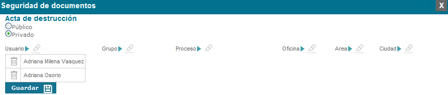 En la ventana de seguridad de documentos se podrá indicar que el documento es privado y quienes son los únicos usuarios que pueden editarlo. También se tiene la posibilidad de definir usuarios de un proceso específico como autorizados para la edición del documento; o usuarios de un grupo, oficina, área o ciudad.