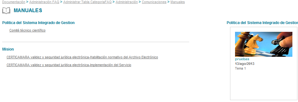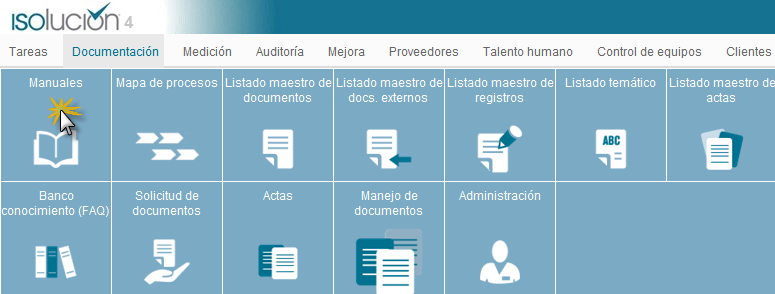 El menú manuales se encuentra ubicado como la primera opción dentro del modulo de documentación, este menú permite la publicación de los diferentes manuales que componen el sistema de Gestión.