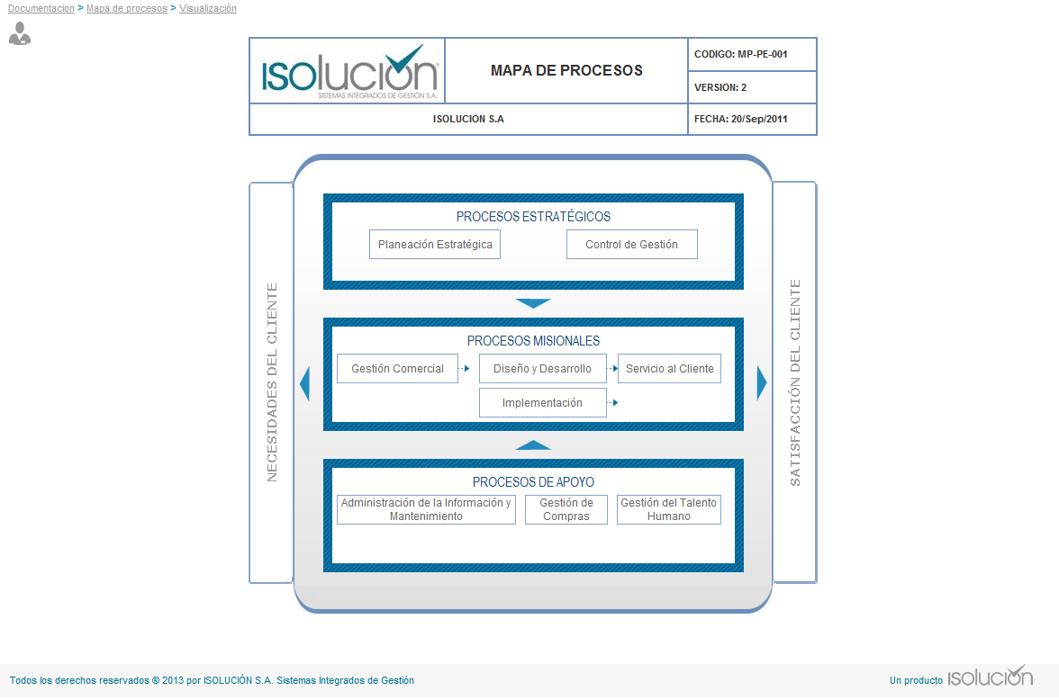 El menú mapa de procesos permite la visualización del mapa de procesos de la organización. Recuerde, para poder consultar el Mapa de Procesos de la Organización se debe primero aprobar y publicar, para esto consulte el Numeral 5.1 Tablas básicas – Sucursal.