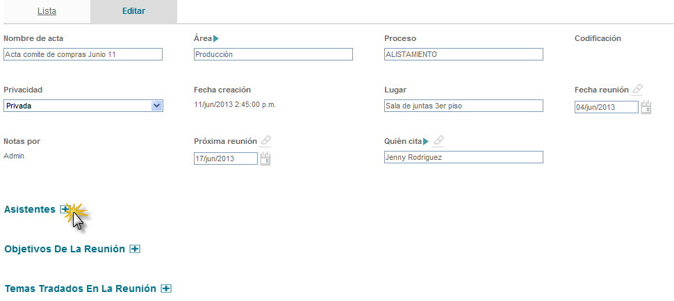 La sección asistentes permite la selección de usuarios asistentes a la reunión y los usuarios que deben tener copia del acta.