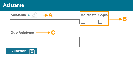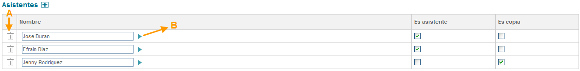 Dando clic en el botón el usuario quedará registrado en el listado de asistentes. Los usuarios seleccionados podrán ser borrados desde el icono eliminar (campo A en la imagen) ó cambiados desde el iconoflecha(campo B en la imagen).