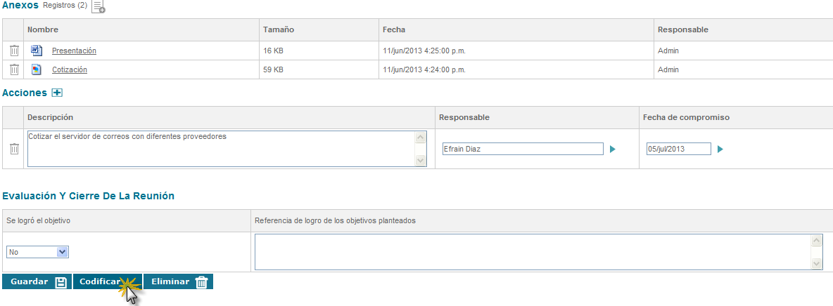 Dando clic en el botón el objetivo quedará registrado en el acta.