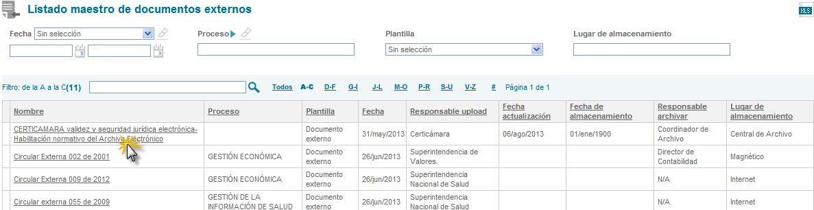 Nota: Las columnas del listado maestro de documentos externos dependen de la parametrización del mismo. (Ver manual de parámetros públicos)