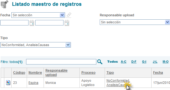 Este listado muestra todos los archivos (evidencias) que se cargan como anexos a ISOlución®; por ejemplo, si en una no conformidad de carga un archivo como evidencia de la realización de determinada actividad, ese archivo se publicará en el listado maestro de registros.