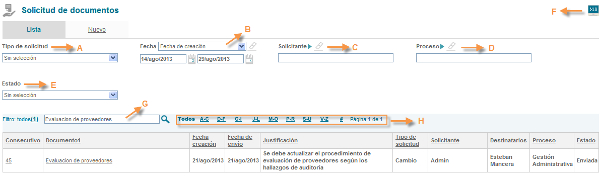 13. Filtro alfanumérico para búsqueda de documentos ya creados.