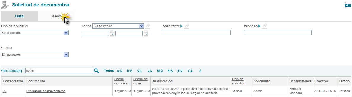 1. Filtro para buscar solicitudes según el tipo (creación, modificación o anulación)