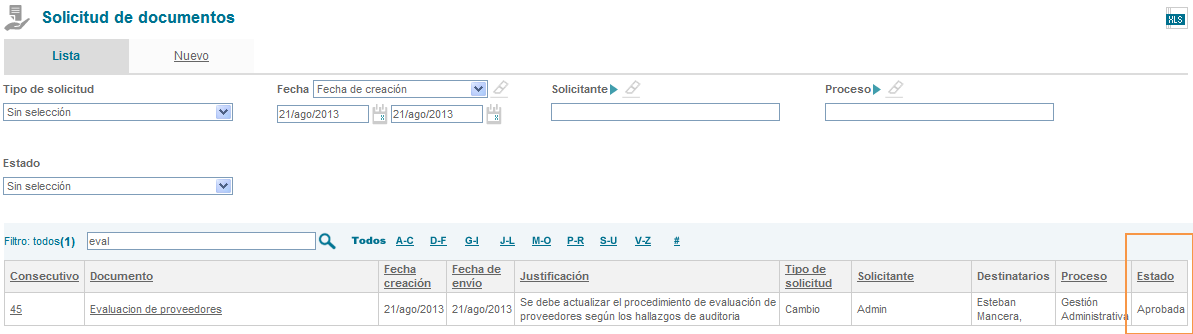 En el listado de solicitudes, la solicitud de documento cambiará de estado según la respuesta del destinatario (Aprobada o Rechazada).