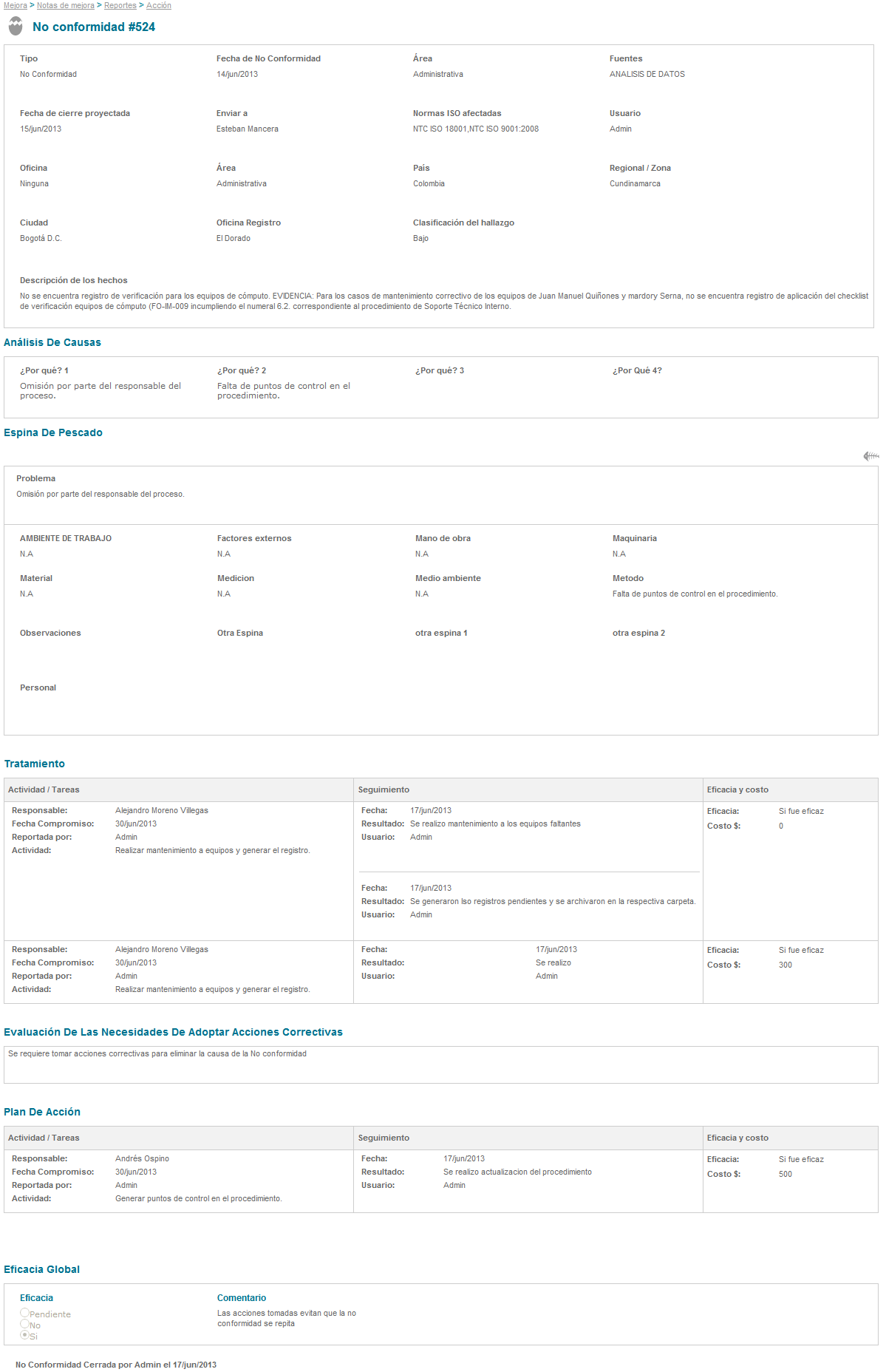 Acciones Correctivas: Dentro de esta sección se reportan las no conformidades, productos no conformes y quejas y reclamos; posteriormente se asignan acciones encaminadas a eliminar la causa o causas de la no conformidad detectada u otra situación indeseable.