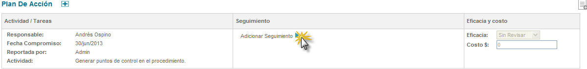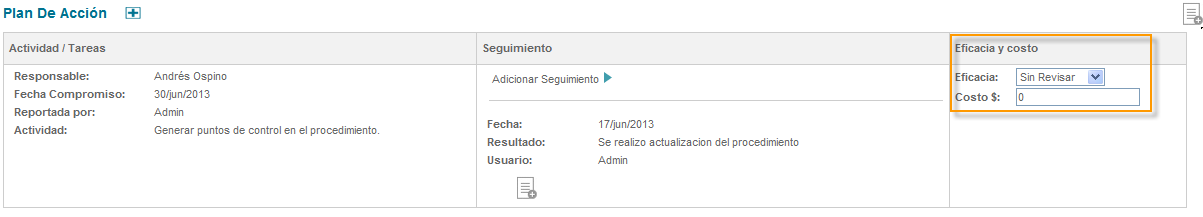Nota: Los campos de eficacia y costo de las actividades lo dará el responsable de la no conformidad; o según esté configurado el parámetro “Seleccione el responsable de cerrar las Actividades de Tratamiento en Mejoramiento Continuo.” (Ver manual de parámetros públicos)