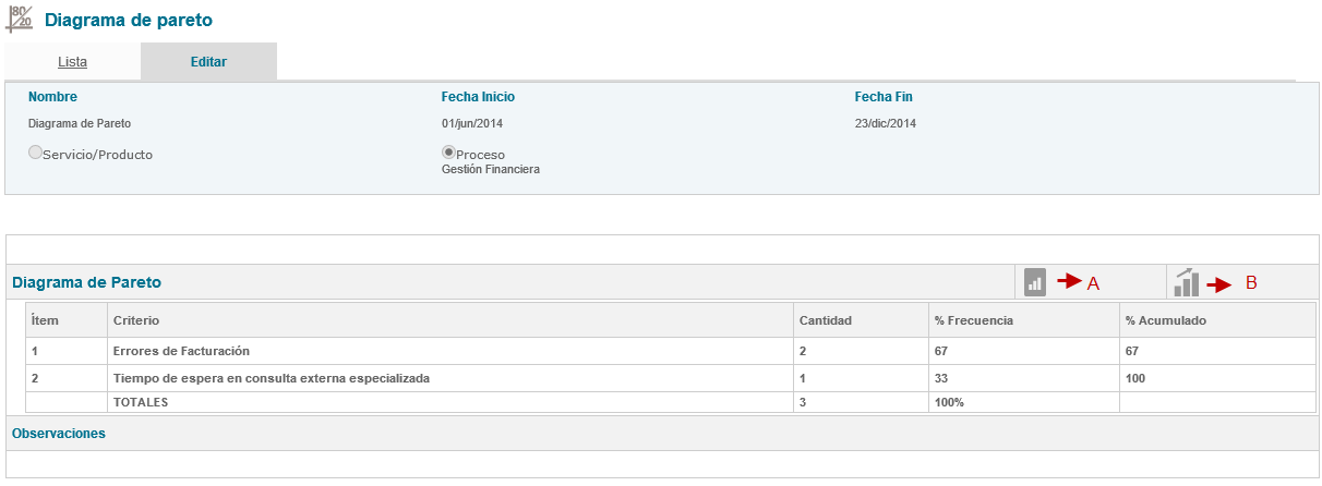 Permite visualizar las gráficas que se generan a partir del diagrama de Pareto.
