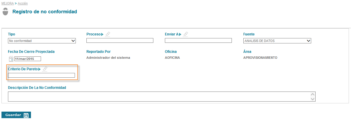 Dentro de los tipos de no conformidad se visualizará el campo criterio de Pareto para seleccionar la falla por la cual se originó el incumplimiento.