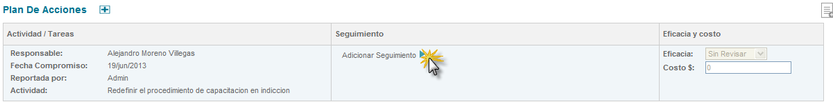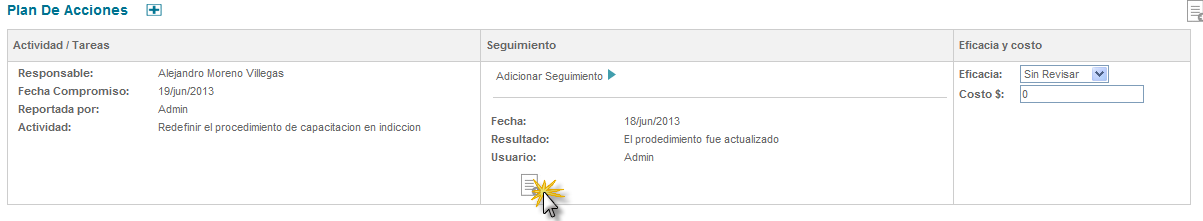 Costo: Campo numérico, no obligatorio, para indicar si la ejecución de la actividad tubo algún costo. Este campo ayuda a cuantificar los costos de no calidad.