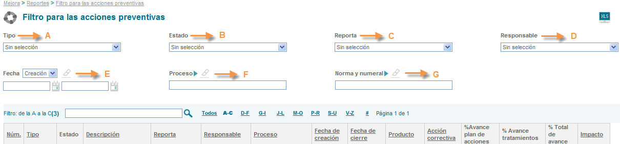 Nota: Los filtros que se muestran para cada tipo de acción preventiva dependen de la parametrización de estos tipos de acciones.