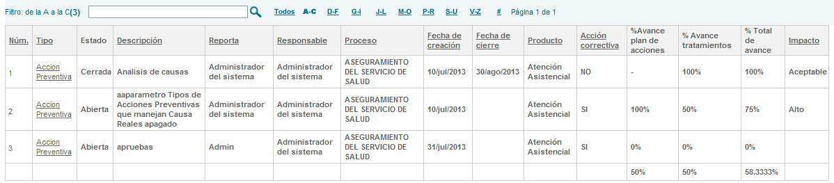 El listado de acciones correctivas funciona igual que el listado de acciones preventivas.