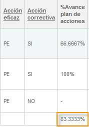 Al final de la columna se mostrará el promedio de avance según el filtro que se esté realizando. Este promedio solo tiene en cuenta los hallazgos que ya cuentan con actividades de plan de acción.