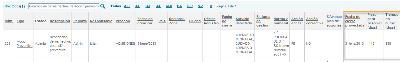 Los tipos de hallazgos preventivos que cuenten con el campo fecha de cierre proyectada contarán con la siguiente información en el listado.