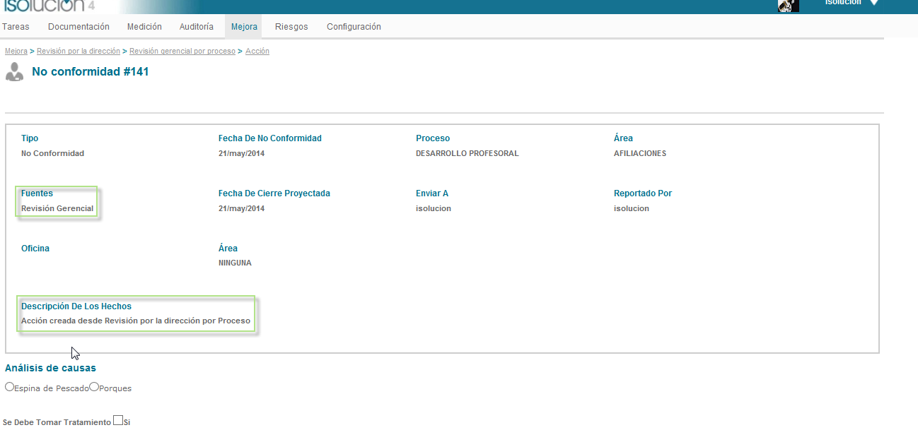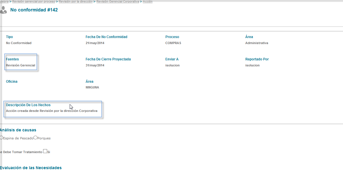 El análisis de causas de una no conformidad pretende encontrar la causa raíz del incumplimiento (lo que originó el incumplimiento). En ISOlución® este análisis de causas podrá ser realizado mediante la metodología de los porqués o la espina de pescado (ver manual de parámetros).