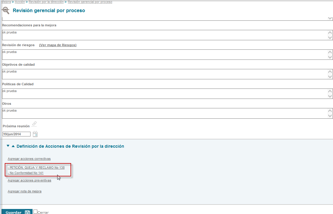Al regresar a la revisión gerencial por proceso se visualizaran las acciones que hayan sido ingresadas.