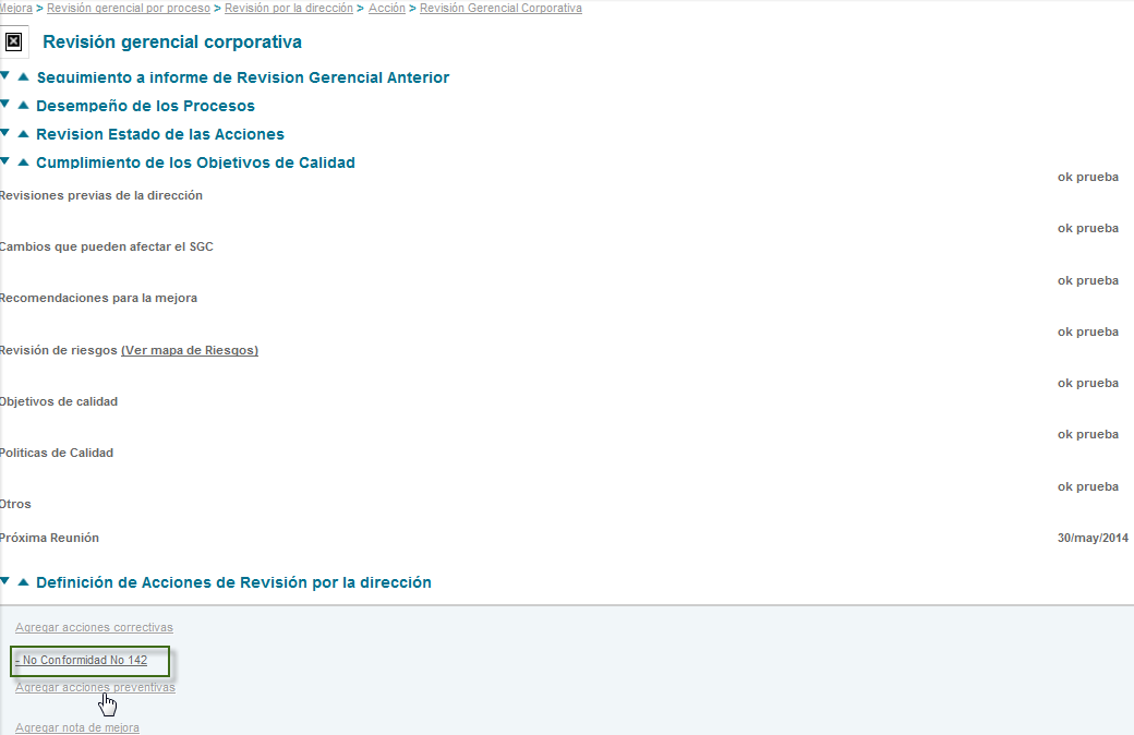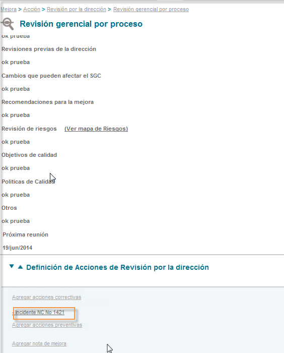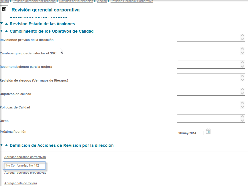Definición de Acciones Previas de revisión por la dirección: Al desplegar la fecha aparecen links para agregar acciones, se pueden agregar acciones correctivas, preventivas y de mejora.