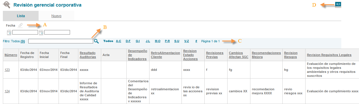 C: Filtro alfanumérico para búsqueda de revisiones gerenciales corporativas ya creadas.