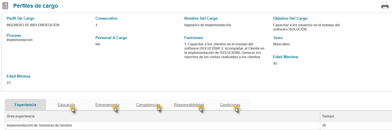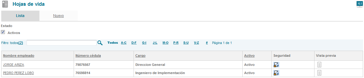 Se puede visualizar al consultar el cargo seleccionado la información básica del empleado, como: Nombre, Sexo (género), Edad, Correo electrónico. Se debe recordar que está información es la registrada a través de la opción de Hojas de vida en listado maestro perteneciente a este módulo.