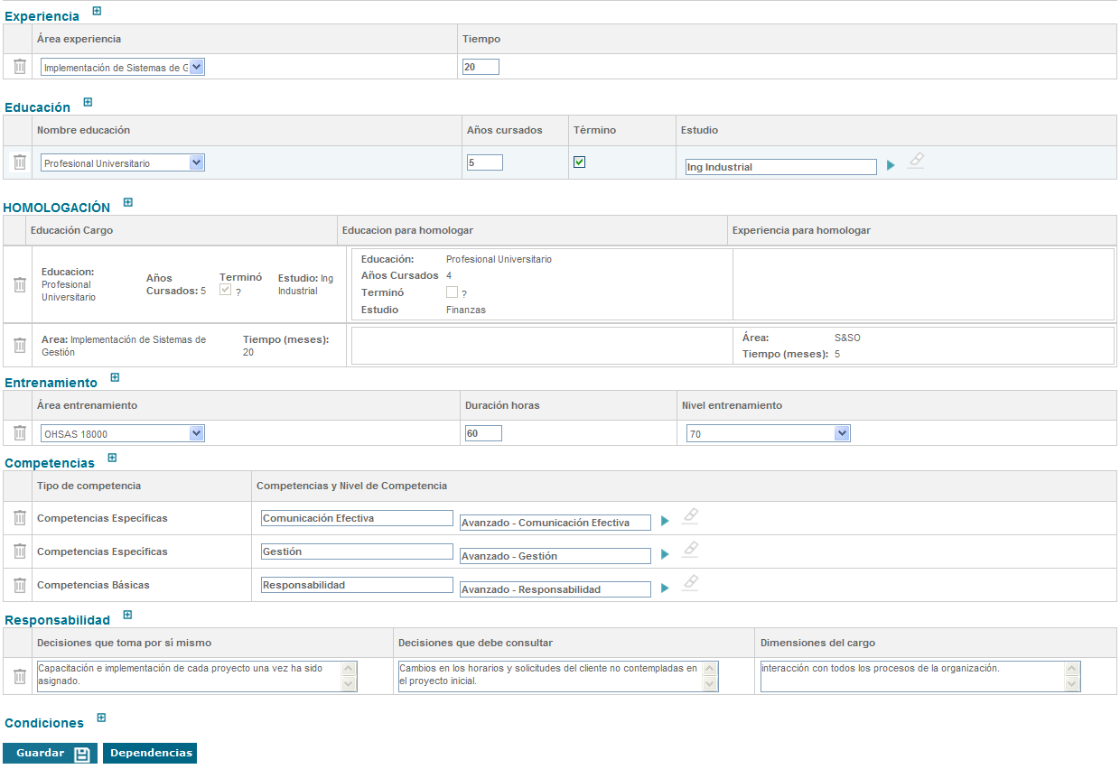 : Para eliminar un cargo, se deberá dar clic en el botón, si no se encuentra habilitado y frente a este aparece el botón “Dependencias”, esto indica que el cargo se encuentra relacionado dentro del sistema y no podrá ser eliminado mientras exista este vínculo.Esta sección permite crear y/o modificar las hojas de vida y perfile de cargo del personal de la compañía.