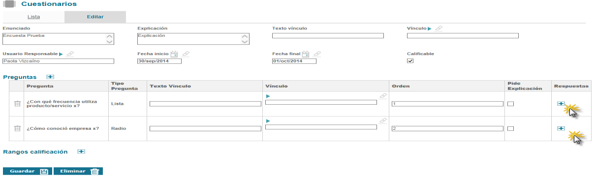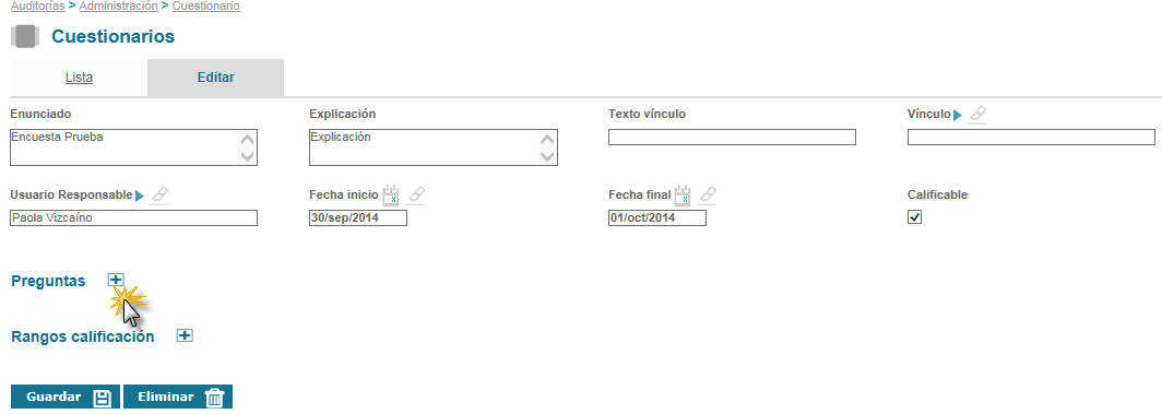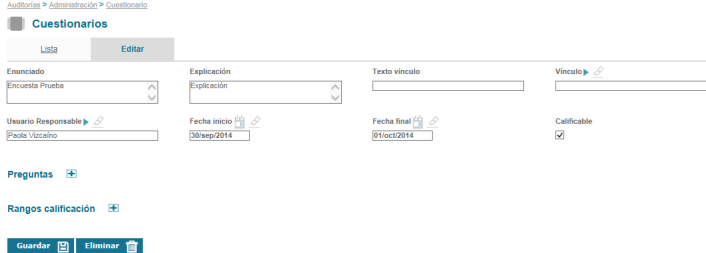 Es necesario ingresar al cuestionario generado, y el sistema habilitara Preguntas y Rangos de Calificación.