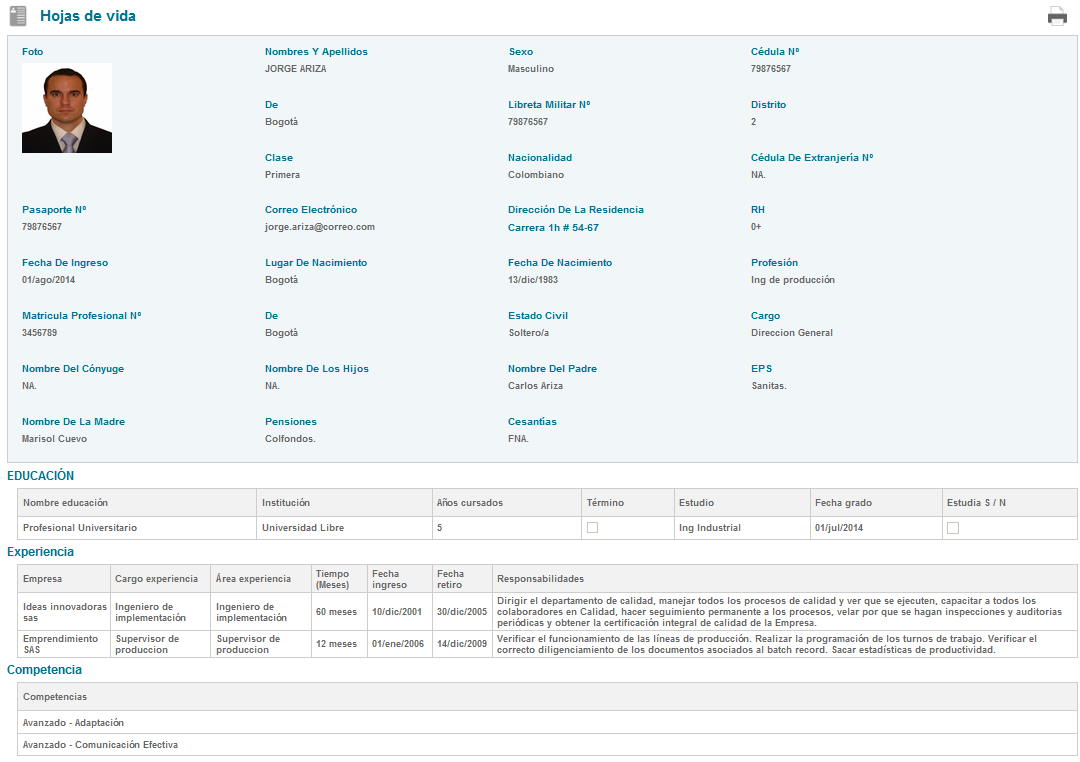 Hoja de vida: Al dar clic sobre está opción permite consultar al detalle toda la información de la hoja de vida del empleado consultado.