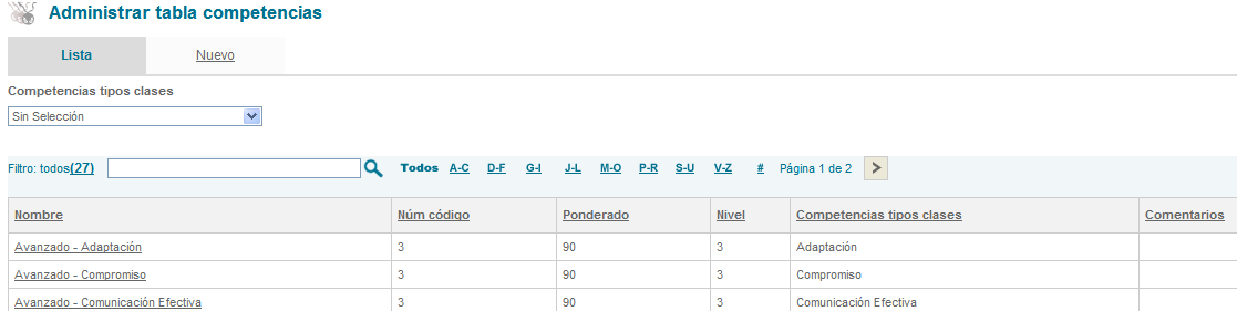 Al dar clic en esta opción, se ilustrará los filtros necesarios para buscar las competencias creadas y las dos opciones de “Lista” y “Nuevo”.