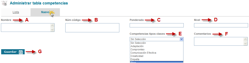 Para adicionar un nuevo nivel de competencia, se debe seleccionar la opción Nuevo: Allí se muestra lo siguiente