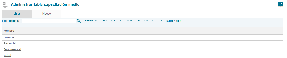 Al dar clic en esta opción, se ilustrará los filtros necesarios para buscar los medios de capacitación creados y las dos opciones de “Lista” y “Nuevo”.