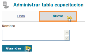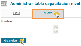 Para adicionar un nuevo nombre de un curso o capacitación, se debe seleccionar la opción Nuevo: Allí se habilita un campo de texto para el registro del nuevo nivel de capacitación crear, una vez se realiza el registro se debe dar clic en el icono