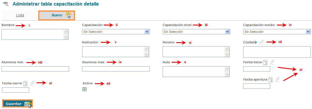 Para adicionar un nuevo detalle de una capacitación o curso, se debe seleccionar la opción Nuevo: Allí se habilita un campo de texto para el registro del nuevo nivel de capacitación crear, una vez se realiza el registro se debe dar clic en el icono