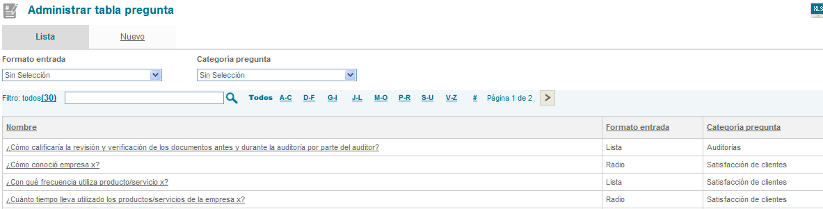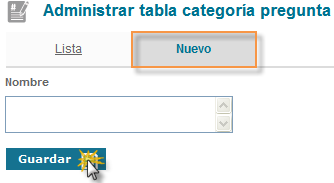 Al dar clic en esta opción, se ilustrará los filtros necesarios para buscar los nombres de las categorías de preguntas creadas y las dos opciones de “Lista” y “Nuevo”.