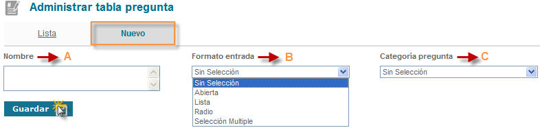 Al ingresar el usuario encontrara dos filtros que le facilitaran la búsqueda de las preguntas por formato de entrada y categoría de pregunta, a su vez la puede buscar por texto o selección alfanumérico.