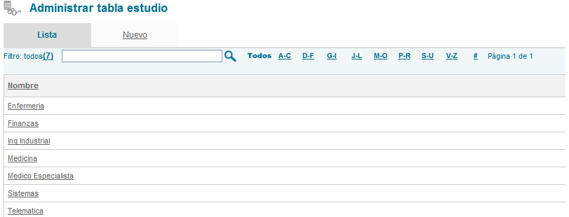 Esta opción permite crear las carreras técnicas, profesionales y postgrados, entre otras, las cuales se vincularan dentro de las hojas de vida y perfiles de cargo.