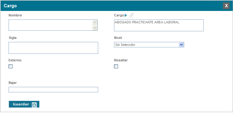 Tabla que permite definir el listado de cargos de la organización, se debe tener en cuenta que a partir de los cargos creados, se generará automáticamente el organigrama de la compañía que se visualiza a través de este modulo.